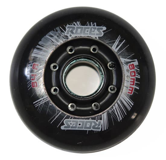 Roces mise sur une platine en aluminium extrudé. Elle s’avère assez compacte avec ses quatre roues de 80 mm pour une dureté de 84A. Elle est vissée à la coque et donc offre des possibilités de réglages latéraux. Le Roces X35 possède un double entraxe 165 mm / 195 mm sous la coque. Les roulements utilisés sont des ABEC 7. Les axes simples de type course permettent un serrage rapide et facile.